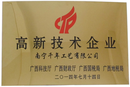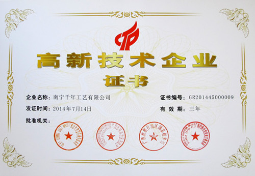 (本網(wǎng)訊) 熱烈慶祝集團(tuán)公司------千年工藝獲得了由廣西科技廳、廣西財政廳、廣西國稅局、廣西地稅局聯(lián)合頒發(fā)的“高新技術(shù)企業(yè)證書”,成為廣西2014年首批國家級高新技術(shù)企業(yè)之一。