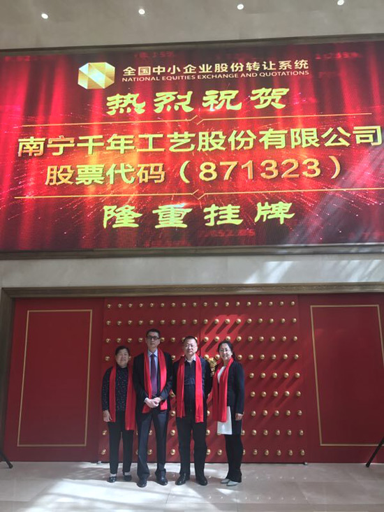 2017年5月5日,在北京金融街金陽大廈內(nèi),隨著開市寶鐘的敲響,南寧千年工藝股份有限公司(企業(yè)簡稱:千年工藝,股份代碼:871323)在全國中小企業(yè)股份轉(zhuǎn)讓系統(tǒng)成功掛牌上市,成為廣西首家正式登陸新三板資本市場的工藝制造企業(yè),這是總公司在發(fā)展進(jìn)程中的一個重大里程碑!