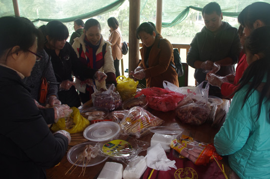 10:30分,我們正式抵達目的地“竹泉島山莊”,大家紛紛參與到午餐的準備活動中,生火、穿菜、刷油、配料、烤串……,大家紛紛施展各自拿手絕活,忙得不亦樂乎,不一會大家親手烤制的肉串就飄出陣陣誘人的香氣。太陽很應景在此刻從云層中鉆出,金色的光芒透過樹蔭照在每個朝氣蓬勃的笑臉上。